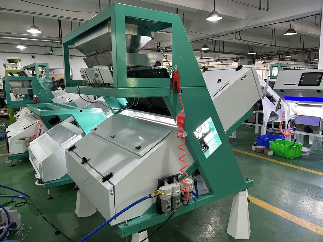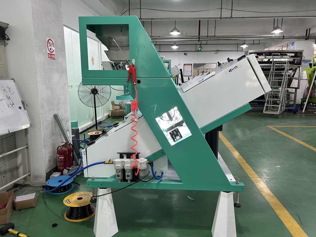 يتم إدخال المواد الخام في الآلة من قادوس المواد الموجود في الأعلى، ويتم اهتزازها بواسطة وحدة التغذية الاهتزازية والانزلاق على طول مجرى المواد إلى منطقة المراقبة في غرفة الفرز من خلال المستشعرات واللوحة الخلفية. تحت تأثير مصدر المصابيح، يستقبل مستشعر CCD الضوء المركب من المواد التي يتم فرزها. وفقًا لتغيرات شدة الضوء واللون، اجعل النظام ينتج إشارة إخراج ويقود الصمام اللولبي (القاذف) للعمل، مما يؤدي إلى طرد الحبوب المتغيرة اللون إلى غرفة الرفض والمواد الجيدة تواصل السقوط في غرفة القبول النهائية